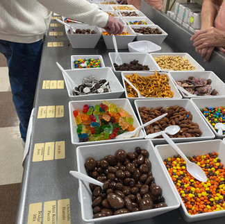 After being given our numbers and hair nets, we entered the production area and stopped at the first of three stations where we could make our own treats to take home! The first stop was apples Now, I love apples anyway, but being given three different options of melted sweet goodness to dip them in was just the best way to start a Friday evening. After choosing your dip, you can head over to add any the toppings of your choice. I went with caramel dip and toasted coconut topping. I could have added more, but chose to go all out with the candy bar instead! This was my favorite part. There was a table filled with bowls of toasted coconut, coffee, almonds, pecans, peanuts, candy pieces, walnuts and toffee chips to add to your milk or dark chocolate bar. You mix it up, press it into a mold and send it through the chiller and when you’re done you have your very own custom candy bar. Mine was sooo good! The coffee really gave it some added depth - be sure to try it when you go next year! After our custom candy bar, we filed chocolate dipped waffle cones with dried fruit, nuts and candies. Our treat cones were the final stop in the production room and a fun treat to make and snack on later! After our treats were made, we walked the production facility and the store itself sampling chocolates until we just couldn’t eat any morel The gracious staff at Coblentz had hot coffee and bottles of water ready to us so we could cleanse our palates at each tasting stations. These tasting stations were set up everywhere. Table upon table filled with all your favorite chocolates, spiced nuts, flavored popcorn, mints, caramels and fudge. The whole experience was truly a treat for the senses. In addition to tasting and smelling amazing, Coblentz chocolates are visually appealing as well. Smooth chocolates, walls of gummy treats an jelly beans and gift sets in the shape of a baseball, golf bag or even a tool set is just so impressive. We walked away with a fairly large bag goodies; not only the treats we made, but plenty of extras to take home for our families & friends! I’m so looking forward to going back next year! And one of the best parts is that you can order your favorite treats online; Coblentz ships anywhere in the US so visit www.coblentzchocolates.com or stop by the store and pick up some amazing chocolates! Coblentz Chocolates is supplying all the chocolates for this year’s Best of Ohio’s Amish Country Chocolate Tour so be sure to get your tickets right away!